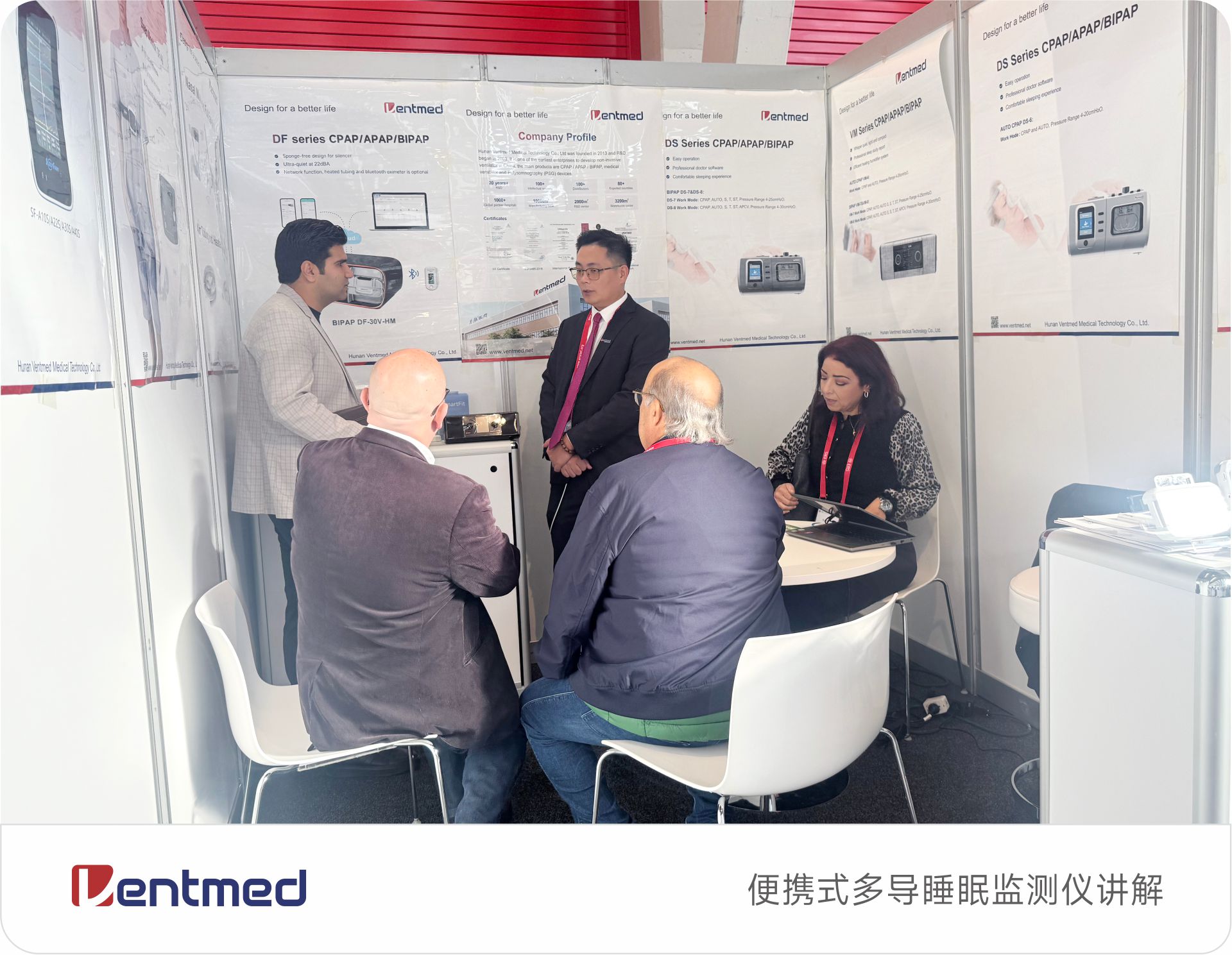 万脉医疗携睡眠呼吸解决方案亮相展会,重点展示三大核心产品:全新升级的 SF-A 系列多导睡眠监测仪,通过国家专项安全认证并兼容国际标准,采样率提升至 500Hz,采用 24 位高精度 ADC 架构;DF 系列无创呼吸机,具备智能温湿控和实时血氧监测功能,超静音设计,已在全球 80多个国家广泛应用;以及参与国家 "四大慢病" 专项的 SF-C 系列穿戴式睡眠记录仪,高灵敏度设计支持家庭便捷监测。